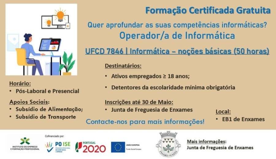 A Junta de Freguesia de Enxames informa que o Instituto do Emprego e Formação Profissional irá realizar nesta freguesia um curso de informática, com o intuito de criar bases de conhecimento das tecnologias informáticas e destina-se a formandos com escassas ou nenhumas aptidões adquiridas nesta área. Pode também ser útil a pessoas com alguns conhecimentos e que queiram cimentar os conhecimentos assimilados.