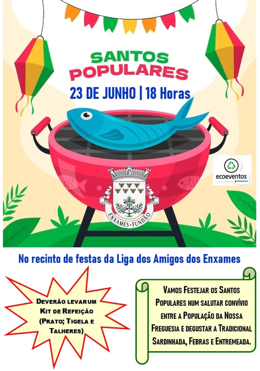 A Junta de Freguesia de Enxames tem a honra de convidar a População desta Freguesia para festejar os Santos Populares, no próximo dia 23 de Junho, pelas 18h:00, no recinto de festas da Liga dos Amigos dos Enxames.