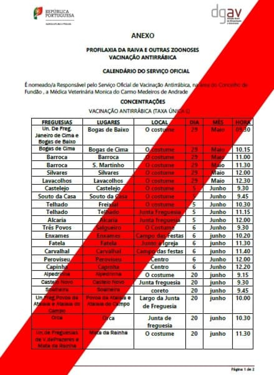 A Junta de Freguesia de Enxames informa todos os interessados que a Vacinação Antirrábica é obrigatória para todos os canídeos com mais de 3 meses de idade, pelo que, a Médica Veterinária Municipal irá proceder à realização da campanha anual de Vacinação da Profilaxia da Raiva e outras Zoonoses, assim como a Identificação Eletrónica, no próximo dia 6 de Junho pelas 10h20m, no Recinto de Festas da Nossa Senhora do Fastio.