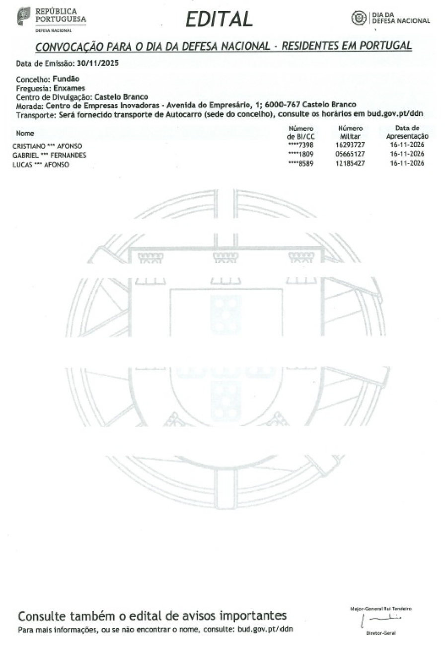 Encontra-se afixado na sede da Junta de Freguesia de Enxames o edital do dia da defesa nacional, dirigido aos jovens desta freguesia abrangidos pela respetiva convocatória, nos termos da abrangidos pela respetiva convocatória, nos termos da Lei do Serviço Alimentar.